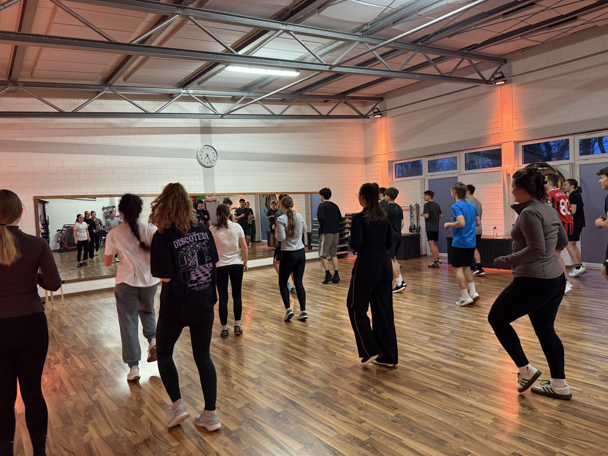 Zum Auftakt finden drei aufeinanderfolgende Einheiten im örtlichen Fitnessstudio „FamilyGym“ am Bahnhof in Jessen statt. Die Erwärmung wird dabei jeweils im Kursraum vorbereitet und von den SchülerInnen selbstständig gestaltet.